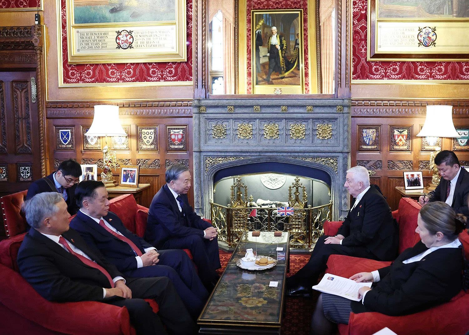 Во время встречи с Председателем Палаты лордов Великобритании Джоном Макфоллом Генеральный секретарь ЦК КПВ высоко оценил роль парламента Великобритании в политической системе страны и его вклад в развитие отношений между Вьетнамом и Великобританией. Он предложил Палате лордов поддерживать расширение сотрудничества между парламентами, правительствами и местными органами власти двух стран в таких сферах, как финансы, наука и технологии, образование и подготовка кадров, оборона и безопасность, а также реагирование на изменение климата.