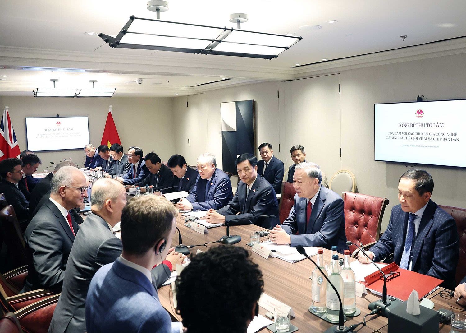 Генеральный секретарь ЦК КПВ То Лам принимает участие в беседе с британскими и международными экспертами по технологиям искусственного интеллекта и полупроводниковых чипов. Фото: ВИА