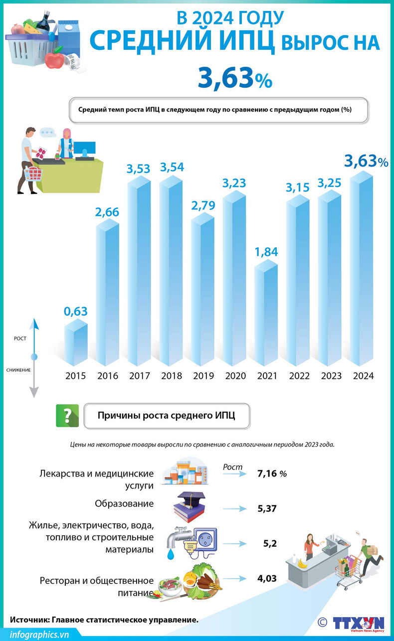 индекс потребительских цен (ИПЦ) Вьетнама в 2024 году вырос на 3,63% по сравнению с предыдущим годом, что соответствует целевому показателю, установленному Национальным собранием (НС), сообщило 6 января Главное статистическое управление (GSO).