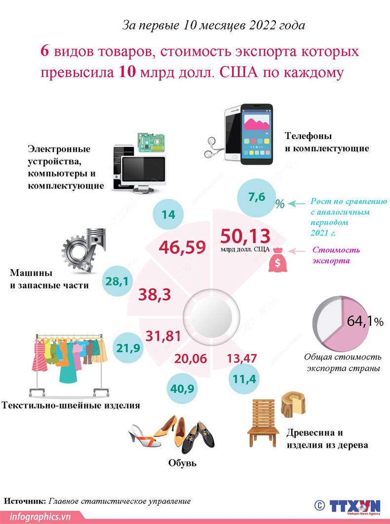 За 10 месяцев 2022 г. зафиксированы 6 товаров, стоимость экспорта которых превысила 10 млрд долларов США по каждому. Стоимость экспорта этих товаров составляет 64,1% от общей стоимости экспорта страны.