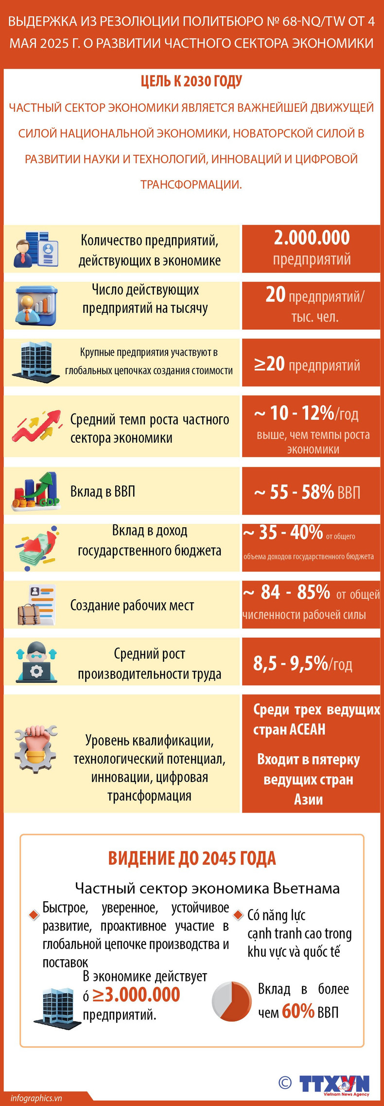 Генеральный секретарь ЦК КПВ То Лам только что подписал резолюцию Политбюро № 68-NQ/TW о развитии частного сектора экономики. В резолюции поставлена цель, согласно которой к 2030 году частный сектор экономики станет важнейшей движущей силой национальной экономики; новаторской силой в области развития науки и технологий, инноваций и цифровой трансформации.