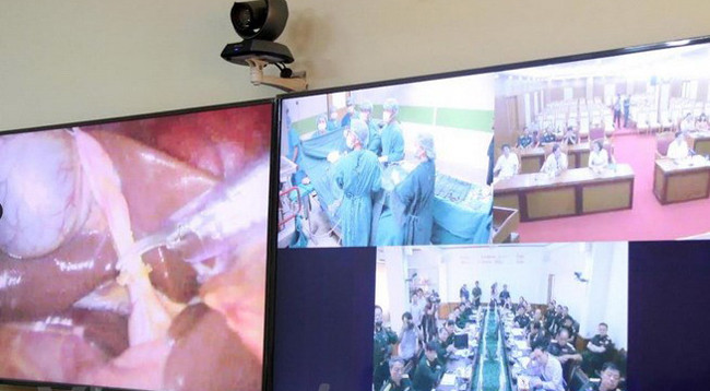 Врачи Центрального военного госпиталя 108 Вьетнама помогают врачам Военного гоститаля 103 Лаоса делать операцию через телемедицинскую систему. Фото: VNA