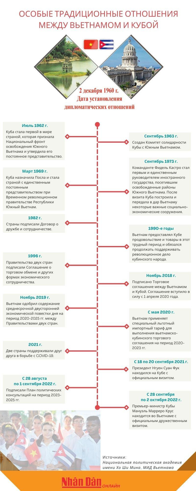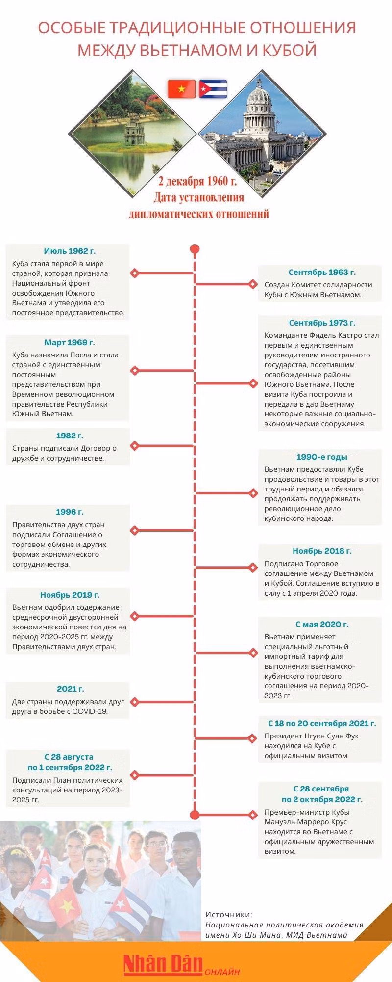 Вьетнам и Куба находятся на расстоянии в полмира друг от друга, но имеют сходство в революционных устремлениях, идеалах и героических традициях борьбы за независимость, свободу, суверенитет и право народа на самоопределение. Это создало возможность и прочный фундамент для развития отношений дружбы и особой солидарности между двумя странами. Вьетнам и Куба установили дипломатические отношения 2 декабря 1960 года. Отношения солидарности, верности, доверия и всеобъемлющего сотрудничества между Вьетнамом и Кубой постоянно укреплялись Президентом Хо Ши Мином, вождем Фиделем Кастро и поколениями руководителей и народами двух стран, стали ценным достоянием в деле защиты и строительства социализма в каждой стране, и эти отношения преодолели многие взлеты и падения в ходе истории за последние более 60 лет.