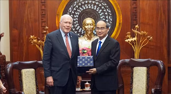 Секретарь парткома г. Хошимина Нгуен Тхиен Нян (справа) и сенатор, Заместитель председателя Комитета по ассигнованиям Конгресса США Патрик Лихи. Фото: VNA