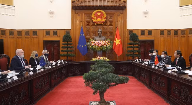 Вице-президент Франс Тиммерманс подтвердил, что ЕС придает большое значение отношениям всеобъемлющего партнерства и сотрудничества с Вьетнамом, высоко оценил обязательства и усилия Вьетнама по реализации результатов COP26. Он отметил, что Вьетнам имеет большие преимущества и потенциал в развитии чистой и возобновляемой энергии. По его мнению, ЕС поддерживает и будет продвигать возможность сотрудничества с Вьетнамом за счет частного инвестиционного капитала, ресурсов ЕС, а также международных финансовых источников.