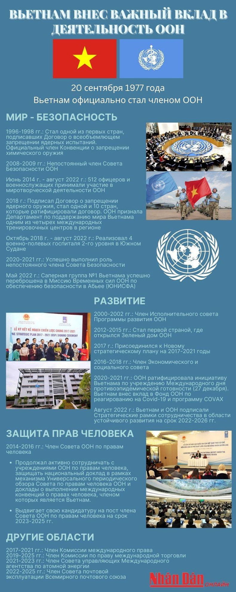Почти 45 лет назад, 20 сентября 1977 года, Вьетнам официально присоединился к Организации Объединенных Наций (ООН), крупнейшей в мире многосторонней организации. С тех пор Вьетнам всегда был надежным партнером и активным участником организации, внес важный вклад в выполнение миссий ООН.