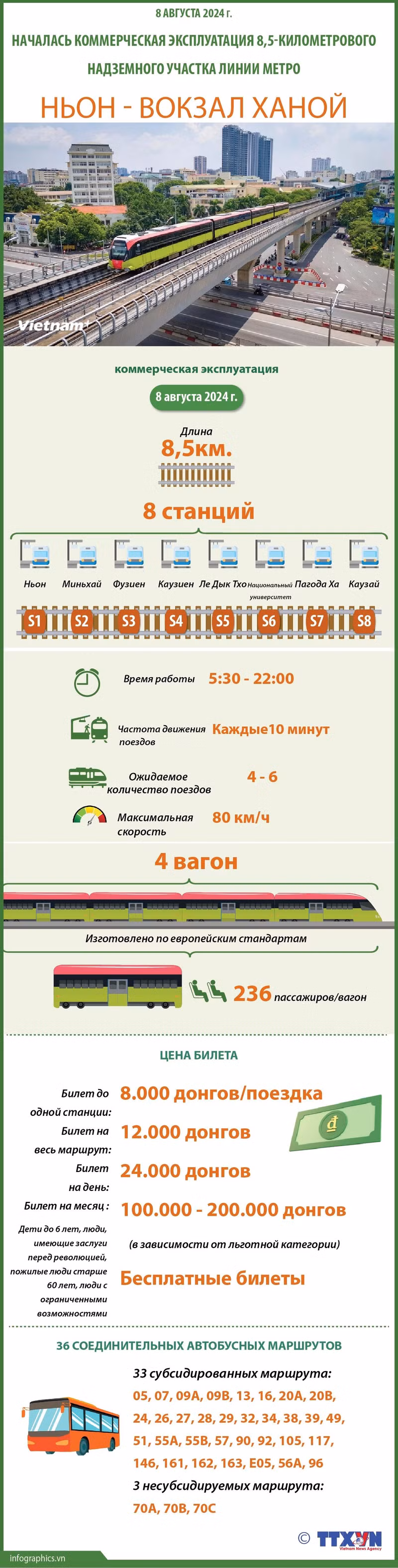 По данным компании «Hanoi Metro Co, Ltd.», в первый день работы 8 августа надземный участок городской железнодорожной линии Ньон – вокзал Ханой протяженностью 8,5 км принял более 34 184 пассажиров.