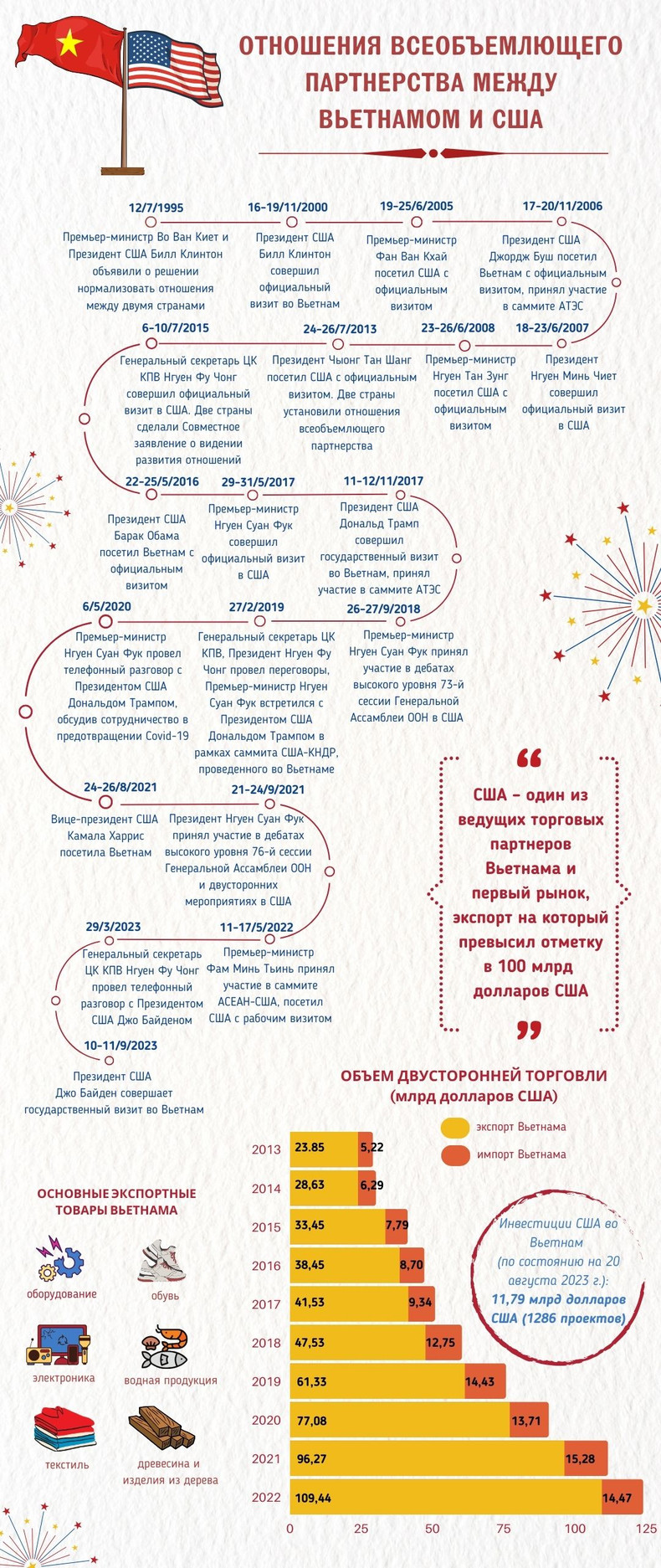 В течение 28 лет после установления дипломатических отношений Вьетнам и США добились больших успехов в двустороннем сотрудничестве. Отношения всеобъемлющего партнерства между Вьетнамом и США глубоко, практически и всесторонне развиваются, внося активный вклад в мир, стабильность, сотрудничество и устойчивое развитие в регионе и во всем мире.