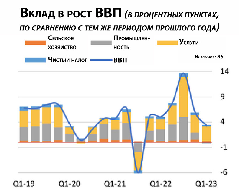 Кроме того, сельское хозяйство достигло довольно стабильных темпов роста в 2,5% и внесло 0,3 процентных пункта в рост в первом квартале 2023 года.