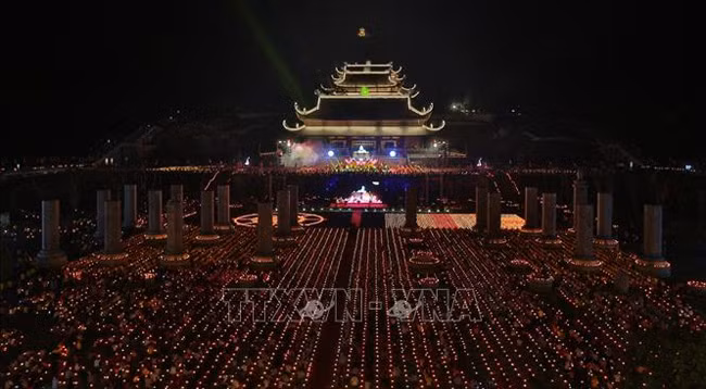 Общий вид церемонии молитвы с цветочными гирляндами и цветными фонарями. Фото: VNA