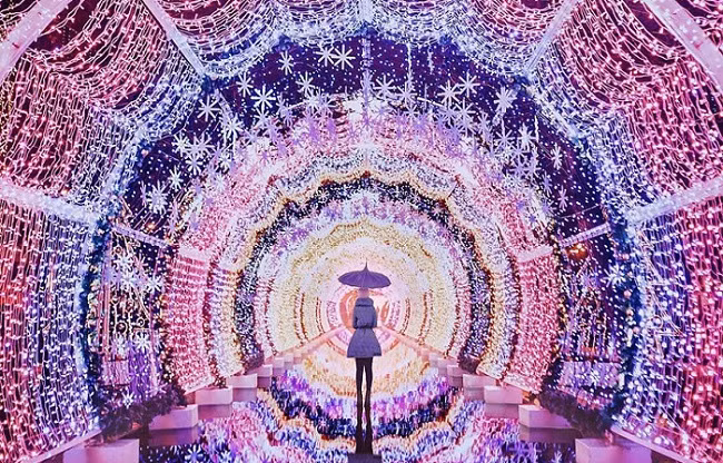 На фоне невероятной световой инсталляции, выполненной в виде сияющего тоннеля с огромными снежинками, модель фотографа выглядит сказочной феей.