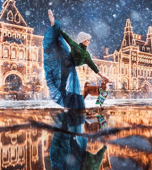 Хрупкая фигурка балерины застыла под падающим снегом перед освещенной громадой театра оперы и балета.