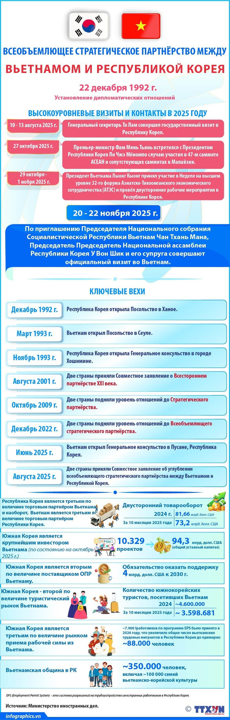пятница, 21.11.2025 18:55 Всеобъемлющее стратегическое партнёрство между Вьетнамом и Республикой Корея По приглашению Председателя Национального собрания Социалистической Республики Вьетнам Чан Тхань Мана, Председатель Национальной ассамблеи Республики Корея У Вон Шик и его супруга совершают официальный визит во Вьетнам.