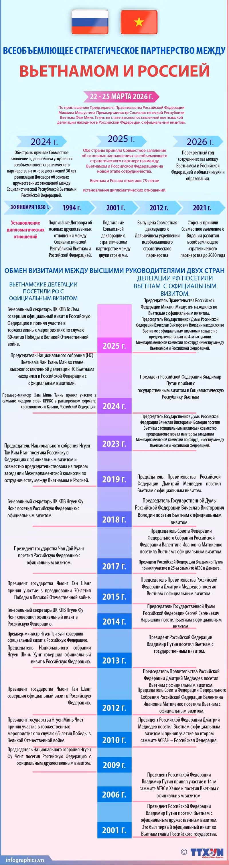 Премьер-министр Фам Минь Тьинь совершает официальный визит в Российскую Федерацию с 22 по 25 марта с целью укрепления всестороннего сотрудничества и закладки основы для стратегических отношений между двумя странами.