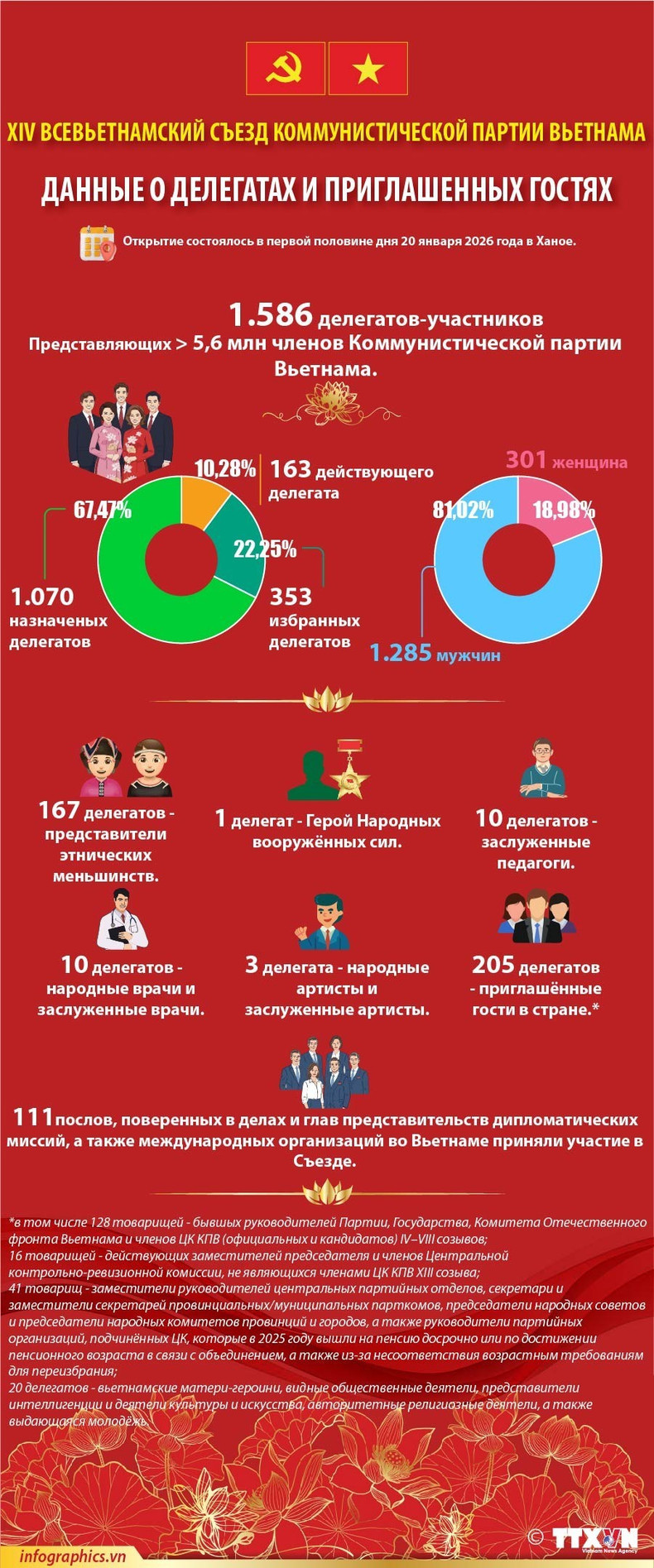 XIV съезд Коммунистической партии Вьетнама официально открылся 20 января 2026 года в Национальном конференц-центре в Ханое. В мероприятии принимают участие 1 586 делегатов, представляющих более 5,6 млн членов Партии по всей стране.