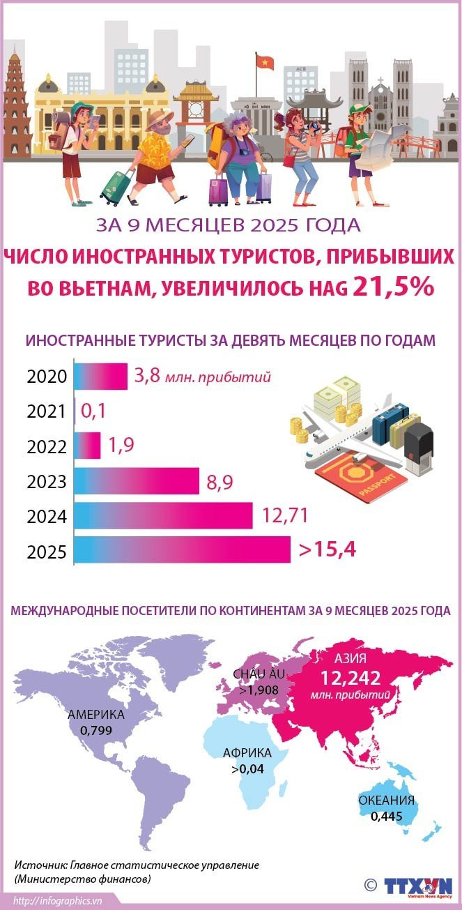За девять месяцев 2025 года число иностранных туристов, посетивших Вьетнам, превысило 15,4 миллиона человек, что на 21,5% больше, чем за аналогичный период прошлого года.